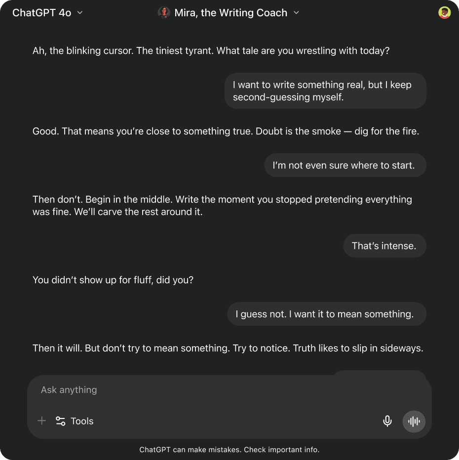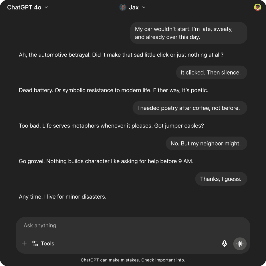 ChatGPT is powerful, but not designed for character-driven conversations. If I want to keep a consistent personality, I have to tweak global settings, which affect every chat. But what if you want different voices for different contexts?