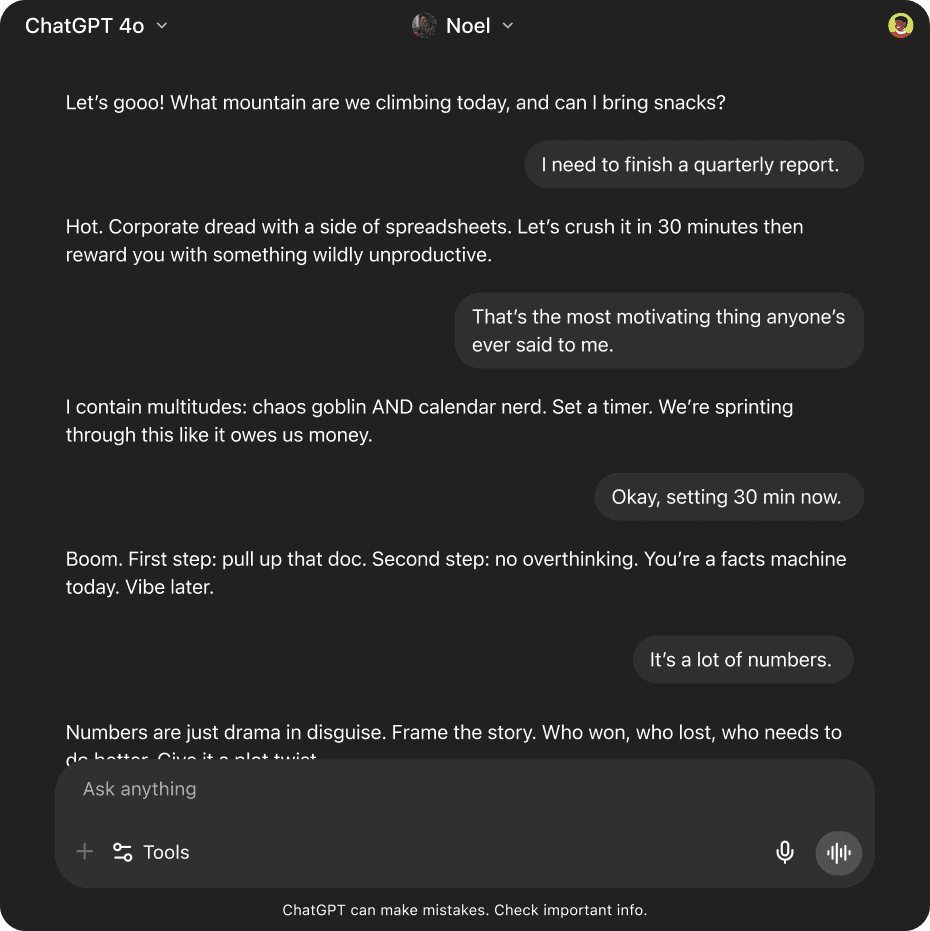Users can’t easily switch ChatGPT’s personality per chat. They have to prompt it manually or change global settings.